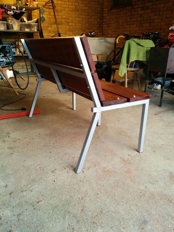 Garden bench with 20 degree back and 5 legs. Very stiff, so I think I chose the right size of tubing for this project. The wood is Sapele from the local wood yard, planed a bit, and with a few coats of Danish Oil.