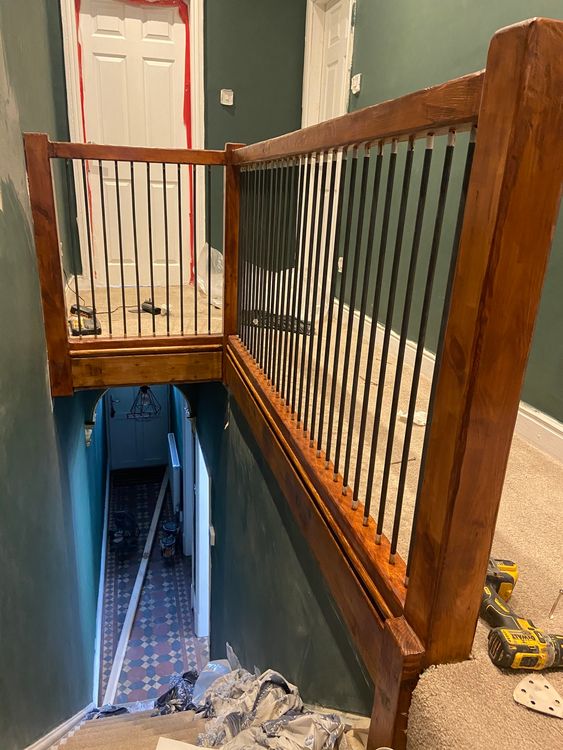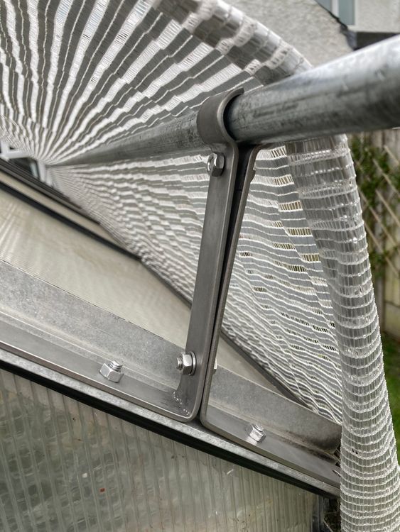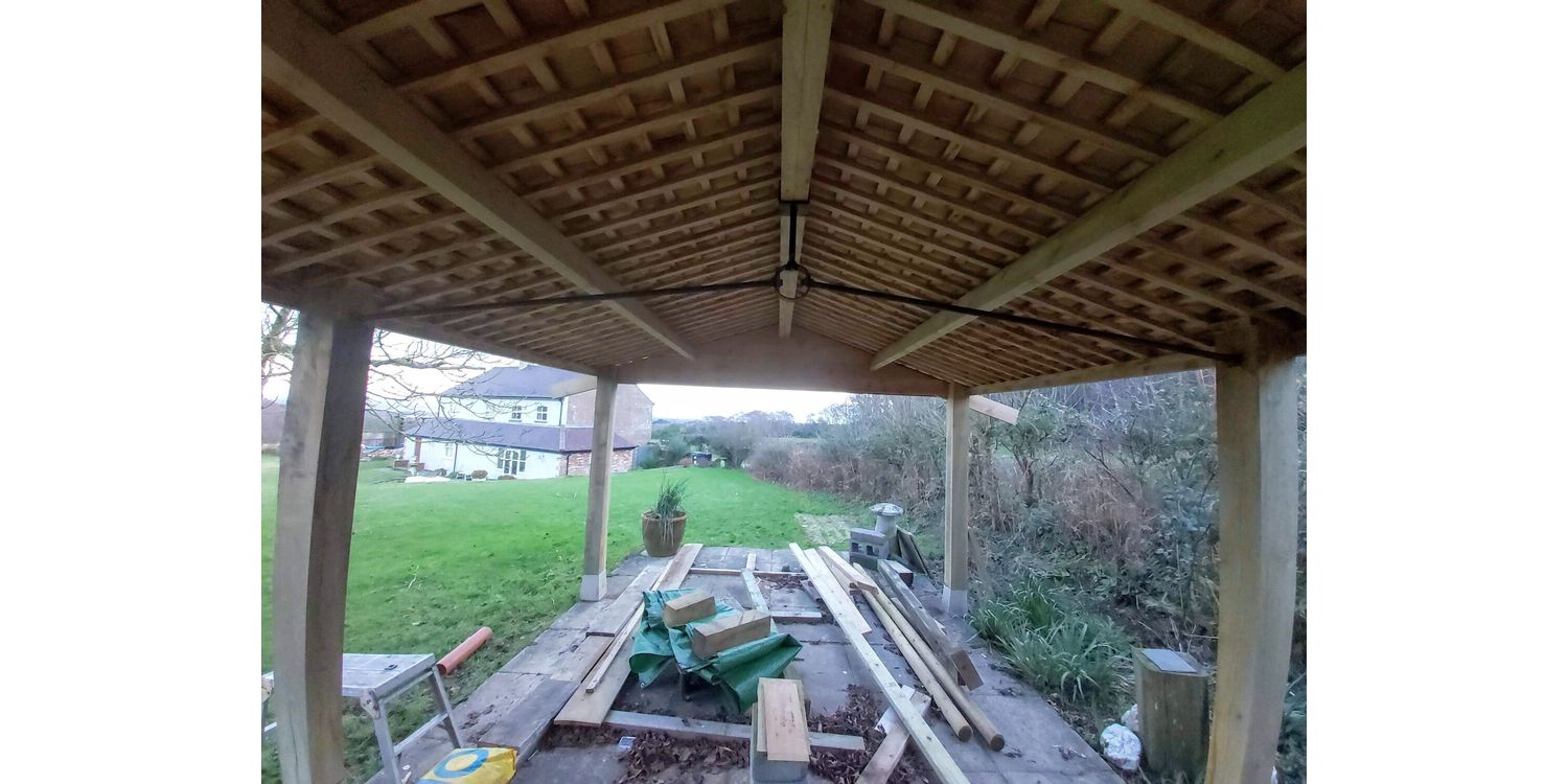 30mm holes drilled through the oak uprights using a brace and bit. Hard work but nice accurate holes. The hoop was welded to a bracket that was bolted to the top beam and the bars then bolted tightly to the hoop to hold the whole thing in place to fully strengthen and support the roof.
