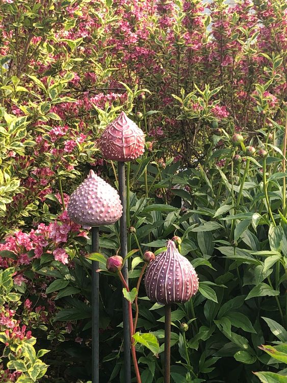 Stoneware clay hand built seed heads on metal poles from Austen Knapman with weigela and peonies.