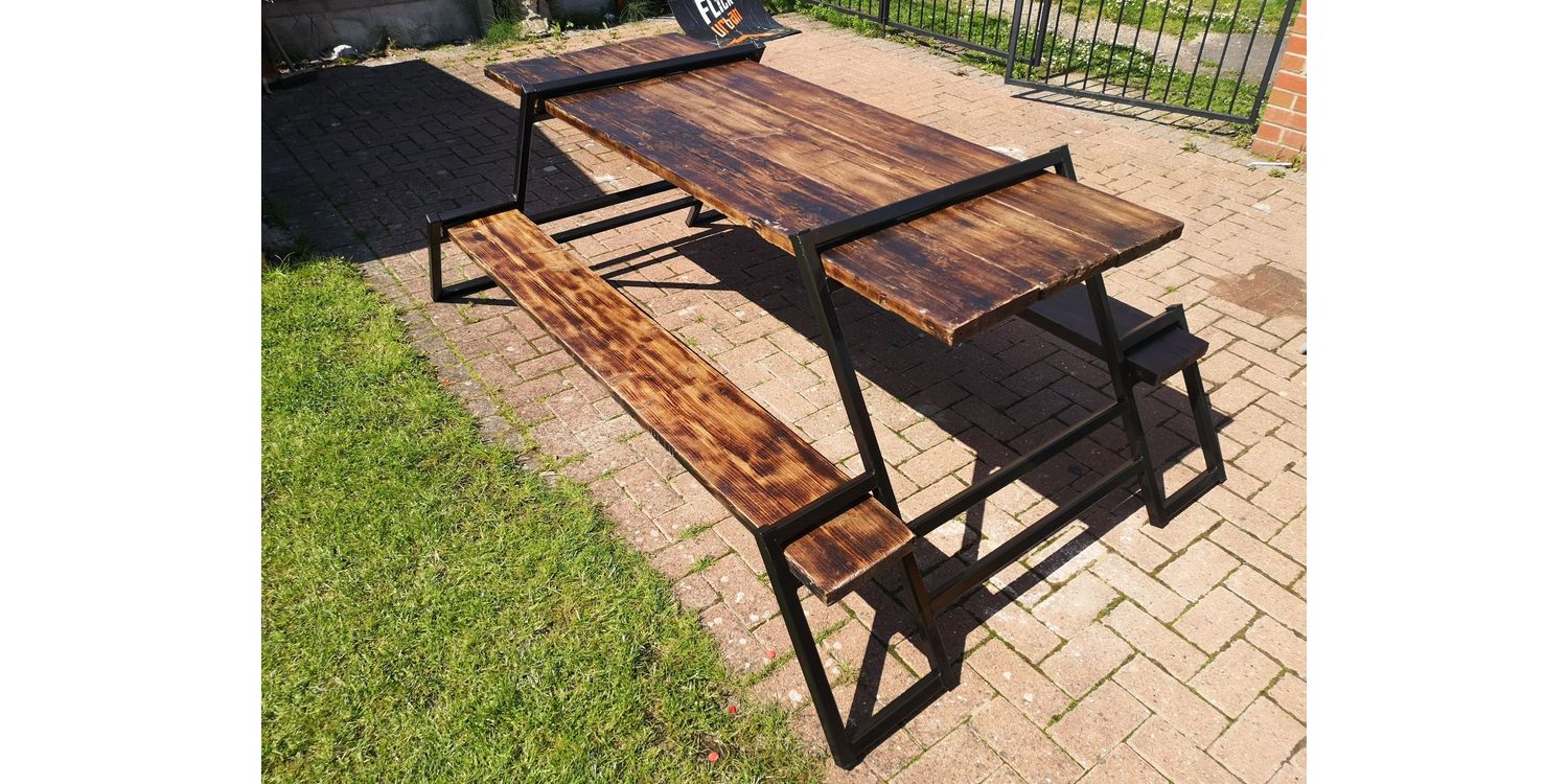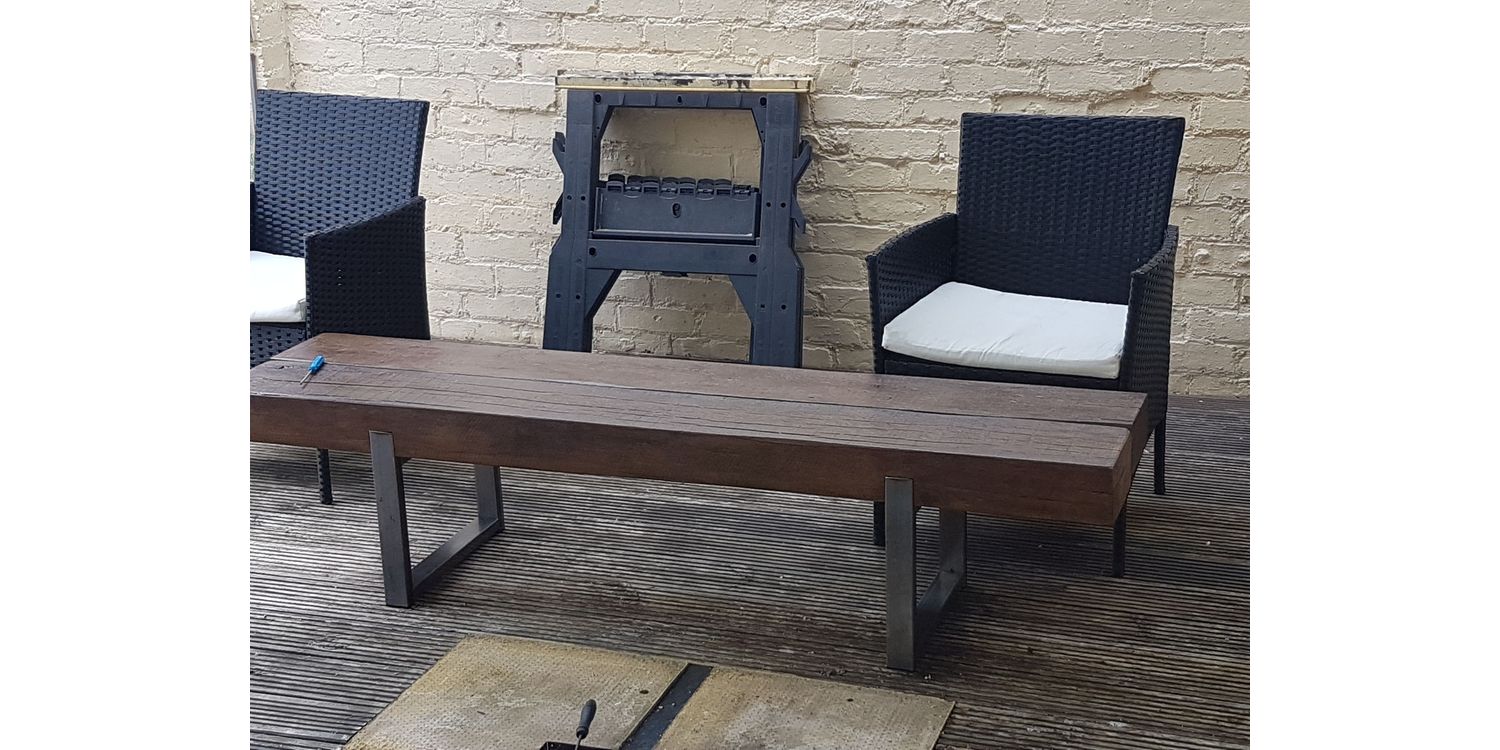 Bench made from box section and recycled scaffold boards